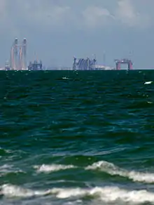 For transportation on the bay, steamboats were commonplace between Corpus Christi and Ingleside during the 1930s.[7] Native Americans used a route made up of a series of shallow oyster beds, dubbed Reef Road. The passage, which was about 18 to 24 inches in depth, could be navigated on foot or horseback during low tides to travel across the opening of Nueces Bay into Corpus Christi Bay. White settlers discovered the road in the 1860s, and it became a common way to pass from Portland to Corpus Christi via buggy, although its jagged course had to be marked with posts and horses would sometimes fall off the beds and drown. A wooden causeway connecting Portland and Corpus Christi was first constructed in 1915, but was repeatedly rebuilt and destroyed by several storms. A permanent concrete bridge was erected in the 1950s, and a double lane was added in 1988.[9] The approximately mile long structure is today known as the Nueces Bay Causeway.[10]