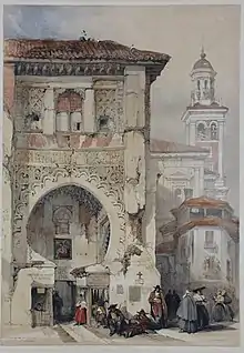 It was located next to the city's central bazaar, the qaysariyya (known today as the Alcaicería), which in turn was located next to the city's Great Mosque (its main Friday mosque), occupied today by the Cathedral.[4] A small bridge, called al-qantarat al-jadida ("new bridge") until 1501 and later Puente del carbón or Puente del Álamo or Puente de los Curtidores (Qantarat al-Dabbayin), was located on the Darro River and linked the building with the bazaar. The building's current name,