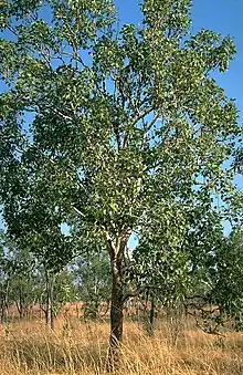 Corymbia foelscheana, commonly known as the broad-leaved bloodwood, fan-leaved bloodwood[2] or smooth-barked bloodwood,[3] is a species of small tree that is endemic to northern Australia. It has thin, rough, tessellated bark on some or all of the trunk, smooth bark above, broadly egg-shaped to broadly lance- shaped adult leaves, flower buds usually in groups of seven, creamy white flowers and urn-shaped fruit.
