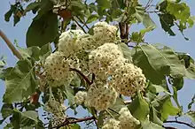Corymbia foelscheana is a tree that typically grows to a height to 5–12 m (16–39 ft) and forms a lignotuber. It has thin, rough, tessellated brown, grey or reddish bark that is shed in small polygonal flakes, on part or all of the trunk, smooth white to cream-coloured bark above. Young plants and coppice regrowth have dull green, broadly egg-shaped to oblong or round leaves that are 170–250 mm (6.7–9.8 in) long and 150–185 mm (5.9–7.3 in) wide with a wavy margin. Adult leaves are arranged alternately, the same shade of dull green on both sides, broadly egg-shaped to broadly lance-shaped, 100–275 mm (3.9–10.8 in) long and 40–135 mm (1.6–5.3 in) wide on a petiole 18–40 mm (0.71–1.57 in) long. The flower buds are mostly arranged on the ends of branchlets on a branched peduncle 9–50 mm (0.35–1.97 in) long, each branch of the peduncle usually with seven buds on pedicels 5–14 mm (0.20–0.55 in) long. Mature buds are oval to pear-shaped, 9–14 mm (0.35–0.55 in) long and 7–9 mm (0.28–0.35 in) wide with a rounded operculum that sometimes has rounded knob in the centre. Flowering occurs from December to January or from January to May and the flowers are creamy white. The fruit is a woody urn-shaped capsule 22–30 mm (0.87–1.18 in) long and 14–24 mm (0.55–0.94 in) wide with the valves enclosed in the fruit.[2][3][4][5][6][7]