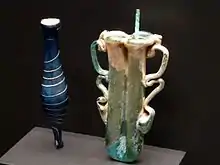 Makeup usually came in tablet or cake form, sold at marketplaces.[7] Wealthy women bought expensive makeup that came in elaborate containers made from gold, wood, glass or bone.[6] Kohl came in compartmentalized tubes that could store more than one color of eye makeup.[7] Glassblowing, invented in the 1st century CE in Syria, lowered the price of containers. The most common color for glass was teal.[2] Gladiator sweat and fats of the animals fighting in the arena were sold in souvenir pots outside of the games to improve complexion.[3]