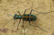 The species is distinct in its large size with iridescent blue and purple body with four white spots. There are hairs below the head (genal region) and the lateral pronotal margins are smooth and unhaired. There is considerable geographic variation and the nominate subspecies is from Southeast Asia. Specimens from India may be assigned to C. duponti barmanica but there may be more than one subspecies in India. They are found mainly along forests and near water.[1] There are several subspecies that are recognized. The species was named after Henry Dupont, a trader in specimens from whom the French entomologist Pierre François Marie Auguste Dejean had obtained a specimen noted as being collected from "Cochinchina" (Vietnam) in 1826.[2]