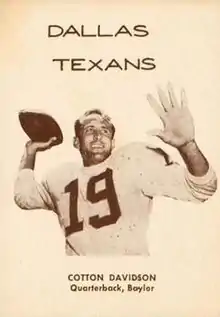 Davidson attended Baylor University, and played professionally for the National Football League's Baltimore Colts (1954, 1957), and the American Football League's Dallas Texans (1960–1962) and Oakland Raiders (1962–1968). Davidson also played quarterback for the Fort Bliss Falcons in 1955 to 1957. A game between the Fort Bliss Falcons and the Fort Sill, Oklahoma Cannoneers was played for a trophy called "The Little Brown Dud." The Cannoneers won the game and took home the Little Brown Dud. Cotton was awarded All-Army Quarterback in 1955.