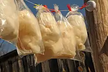 The candy is made by heating and liquefying sugar, spinning it centrifugally through minute holes—by which the sugar rapidly cools and re-solidifies into fine strands.[2] It is often sold at fairs, circuses, carnivals, and festivals—served in a plastic bag or on a stick or paper cone.[3][4][5]