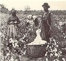 After the Civil War, cotton production expanded to small farms, operated by white and black tenant farmers and sharecroppers.[11] The quantity exported held steady, at 3,000,000 bales, but prices on the world market fell.[12] Although there was some work involved in planting the seeds, and cultivating or holding out the weeds, the critical labor input for cotton was in the picking. How much a cotton operation could produce depended on how many hands (men women and children) were available. Finally in the 1950s, new mechanical harvesters allowed a handful of workers to pick as much as 100 had done before. The result was a large-scale exodus of the white and black cotton farmers from the south. By the 1970s, most cotton was grown in large automated farms in the Southwest.[13][14]