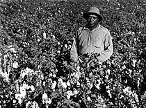 The United States, observed in 1940 that "many thousands of black cotton farmers each year now go to the polls, stand in line with their white neighbors, and mark their ballots independently without protest or intimidation, in order to determine government policy toward cotton production control."[15] However, discrimination towards blacks continued as it did in the rest of society, and isolated incidents often broke out. On September 25, 1961, Herbert Lee, a black cotton farmer and voter-registration organizer, was shot in the head and killed by white state legislator E. H. Hurst in Liberty, Mississippi.[16] Yet the cotton industry continued to be very important for blacks in the southern United States, much more so than for whites. By the late 1920s around two-thirds of all African-American tenants and almost three-fourths of the croppers worked on cotton farms.[17] Three out of four black farm operators earned at least 40% of their income from cotton farming during this period.[17] Studies conducted during the same period indicated that two in three black women from black landowning families were involved in cotton farming.[18]