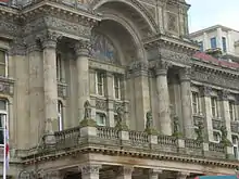 Above the main entrance, which faces Victoria Square, the tympanum contains a mosaic by Salviati Burke and Co. of Venice.[6] Above that, the pediment shows Britannia receiving the manufacturers of Birmingham.[7] Victoria Square itself was once occupied by Christ Church, a building which was demolished in 1899.[8]
