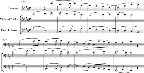 A further example of fluid counterpoint in late Beethoven may be found in the first orchestral variation on the "Ode to Joy" theme in the last movement of Beethoven's Symphony No. 9, bars 116–123. The famous theme is heard on the violas and cellos, while "the basses add a bass-line whose sheer unpredictability gives the impression that it is being spontaneously improvised. Meantime a solo bassoon adds a counterpoint that has a similarly impromptu quality."[10]