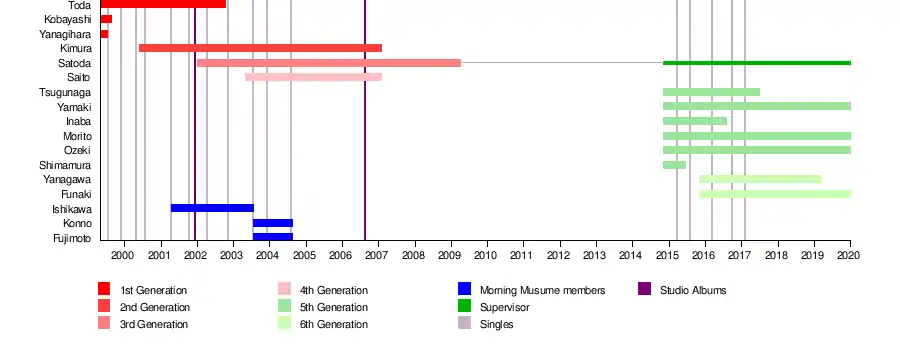 | Past members | As Country Musume: Asami Kimura Miuna Saito Miki Fujimoto Asami Konno Rika Ishikawa Rinne Toda Azusa Kobayashi Hiromi Yanagihara Mai Satoda As Country Girls: Uta Shimamura Manaka Inaba Momoko Tsugunaga Nanami Yanagawa Risa Yamaki Chisaki Morito Mai Ozeki Musubu Funaki |