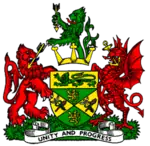 The "chief" or upper third of the shield bearing a lion passant came from the arms of Rowley Regis, and the "per saltire" division of the arms and green and gold colouring was found in Oldbury's insignia. The gold lions on a green background were from the arms of the Robsart family, while the crossed club and caduceus were the arms of James Watt. The crest featured a Saxon crown from which rose a green double-tailed lion, emblem of the Suttons, mediaeval lords of Dudley. The lion held an arrow from the arms of Matthew Boulton. The supporters of the arms were a red lion and dragon. The lion was from the armorial bearings of Sir James Timmins Chance, while the dragon was intended to represent the ancient Britons, founders of the "old burh" or Oldbury. Both animals held objects in their mouths as heraldic differences: an arrow (as in the crest) and an anchor (for Cradley Heath's traditional industry). The motto chosen by the borough was "Unity and Progress".[15]
