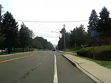 Like in Pearl River, CR 33 splits downtown Nanuet with intersections with CR 42, CR 46, and its child-route, CR 33A. Here CR 33 is still named Middletown Road, but it is also considered Main Street within the business district of Nanuet. As CR 33 leaves downtown Nanuet, it has a rather busy intersection with NY 59. This is because The Shops at Nanuet and the Rockland Plaza strip mall are located at this intersection. After this intersection, CR 33 proceeds north into residential areas of Nanuet running parallel to NY 304. Here it meets CR 60 at Smith Road.[2]