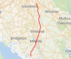 County Route 555 (CR 555) is a county highway in the U.S. state of New Jersey. The highway extends 34.20 miles (55.04 km) from Port Norris Road (CR 553) in Downe Township to Black Horse Pike (Route 42) in Washington Township (in Gloucester County).