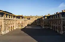 A cour d'honneur (French: [kuʁ dɔnœʁ]; lit. '"court of honor"'; German: Ehrenhof) is a three-sided ceremonial courtyard, created by flanking the main central block, or corps de logis, with symmetrical advancing secondary wings containing minor rooms. The Palace of Versailles (illustration) and Blenheim Palace (plan) both feature such entrance courts.