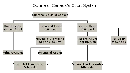 The first is the term "provincial court", which has two quite different meanings, depending on context. The first, and most general meaning, is that a provincial court is a court established by the Legislature of a province, under its constitutional authority over the Administration of Justice in the Province, set out in s. 92(14) of the Constitution Act, 1867.[2] This head of power gives the Provinces the power to regulate "... the Constitution, Maintenance, and Organization of Provincial Courts, both of Civil and of Criminal Jurisdiction, and including Procedure in Civil Matters in those Courts". All courts created by a Province, from the small claims court or municipal by-law court, up to the provincial Court of Appeal, are "provincial courts" in this general sense.