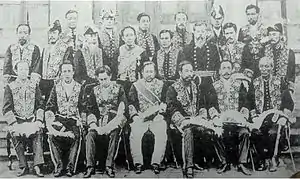 The October 29, 1884, edict 91 of the Dajō-kan allocated court uniforms for chokuninkan and sōninkan on the Board of the Chamberlains and the Board of Ceremonies. These gown-like designs were based on Prussian court clothing,[1]:173 and were supposedly proposed by Yamagata Aritomo.[20]