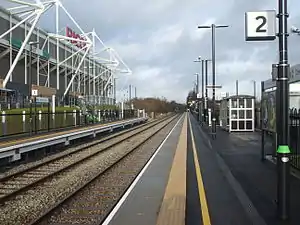 Coventry Arena railway station is a railway station on the Coventry-Nuneaton Line. Located in the north of Coventry, England, it serves the adjacent Ricoh Arena, for which it is named. It was opened on 18 January 2016, along with Bermuda Park station[1] after considerable delays.[2][3]
