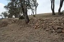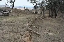 As with the preceding sections of the "Old Bathurst Road" there is more than one road line through this area. Three consecutive roads were identified by Karskens in 1988. Therefore, the actual Cox's road crosses in and out of private property. The earliest line is on the top of the ridge before dropping down to the river in a formation with shallow cuttings. Again the most obvious and substantial physical evidence in this area relates to much later 1820s lines and improvements, including long sections of walling which support an embanked road formation winding down the hillsides.[1]