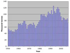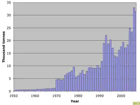 The following table summarises crab production from 2000 to 2008, both caught wild and from aquaculture, in tonnes.[1][4]
