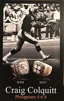 Joseph Craig Colquitt (born June 9, 1954) is a former American football punter who spent eight seasons in the National Football League (NFL) with the Pittsburgh Steelers (1978–1981, 1983–1984) and Indianapolis Colts (1987). He was a member of two Super Bowl Champions with the Steelers in 1978 and 1979. He is also the father of two NFL punters, Dustin and Britton Colquitt. His nephew, Jimmy Colquitt, was a punter for the Seattle Seahawks in 1985. All four played college football at the University of Tennessee.[1] Both his sons won Super Bowl rings, Britton with the Broncos and Dustin with the Chiefs. Craig was inducted into the Greater Knoxville Hall of Fame July 16, 2009. Craig Colquitt is also the author of the children's book: "JoJo! What Happened To Your Hair?".