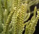 Crassula muscosa has very small, light green leaves that are densely packed around a thin stem, and the arrangement of the leaves around the stems gives them a square shape.[1] It grows as an intricate bush with very small yellow-green flowers, with a maximum height of 15–20 cm.