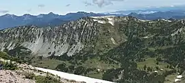 Crescent Mountain is a 6,715-ft (2,047 m) ridge-like mountain located in north-central Mount Rainier National Park, in Pierce County of Washington state.[5] It is part of the Cascade Range, and lies 6.6 mi (10.6 km) due north of the summit of Mount Rainier. Sluiskin Mountain is its nearest higher neighbor, 0.85 mi (1.37 km) to the east.[1] Precipitation runoff from Crescent Mountain drains west into tributaries of the Carbon River.