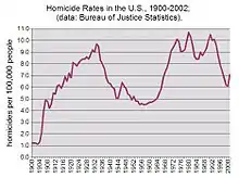 In the long term, violent crime in the United States has been in decline since colonial times. The homicide rate has been estimated to be over 30 per 100,000 people in 1700, dropping to under 20 by 1800, and to under 10 by 1900.[6]
