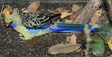 Crimson rosellas forage in trees, bushes, and on the ground for the fruit, seeds, nectar, berries, and nuts of a wide variety of plants, including members of the Myrtaceae, Asteraceae, and Rosaceae families. Despite feeding on fruits and seeds, rosellas are not useful to the plants as seed-spreaders, because they crush and destroy the seeds in the process of eating them.[24] Their diet often puts them at odds with farmers whose fruit and grain harvests can be damaged by the birds, which has resulted in large numbers of rosellas being shot in the past. Adelaide rosellas are known to feed on dormant cherry flower buds.[25] Rosellas will also eat many insects and their larvae, including termites, aphids, beetles, weevils, caterpillars, moths, and water boatmen.[26]