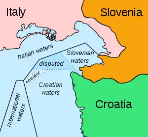 The Croatian side asserts that the corridor in the Croatian waters would be useless for traffic, since traffic regulations in the Gulf of Trieste allow only incoming traffic on the Croatian side of the border, while outgoing traffic must go through Italian waters.[23] The Slovenian response is that Slovenia's access to international waters is not an exclusively practical or commercial issue; it is rather the logical consequence of that Slovenia is said to be an internationally recognized maritime country with granted access to international seas. The latter assertion has been repeatedly disputed by the Croatian side.