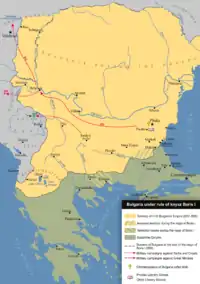 In the second half of the 10th century, the Croatian realm was ruled by Stjepan Držislav. Stjepan formed an alliance with the Byzantine Empire, which in turn recognized him as the King of his lands.[6] After his death in 997, his son Svetoslav Suronja continued his pro-Byzantine policy. His brothers Krešimir III and Gojslav did not want Svetoslav as ruler and attempted a coup d'etat, asking the Bulgarian tsar Samuil for help. Answering their call, Samuil went on a rampage in 998 and razed the Dalmatian cities of Trogir and Split, but he was stopped at the siege of Zadar. The Bulgarian forces then returned home,[7] using the Bosnian route. Territory taken by Samuil during the war was given to Krešimir III and Gojslav, who, with further Bulgarian support, won the Croatian civil war and took over the realm in the year 1000. Svetoslav Suronja, a Byzantine and Venetian ally, was sent to exile in Venice, but after a change in government there he was exiled to Hungary. Following the death of Ivan Vladislav in 1018, Bulgaria fell under Byzantine rule, and Krešimir III and Gojslav, the two Croatian kings, became Byzantine vassals.