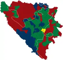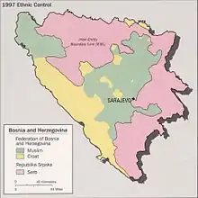 In November 1995 the Dayton Agreement was signed by presidents of Croatia, Bosnia and Herzegovina and Serbia that ended the Bosnian war. The Federation of Bosnia and Herzegovina (FBiH) was defined as one of the two entities of Bosnia and Herzegovina and comprised 51% of the territory. The Republika Srpska (RS) comprised the other 49%. However, there were problems with its implementation due to different interpretations of the agreement.[56] An Army of the Federation of Bosnia and Herzegovina was to be created by merging units from the ARBiH and the HVO, though this process was largely ineffective.[57] The Federation was divided into 10 cantons. Croats were a majority in three of them and Bosniaks in five. Two cantons were ethnically mixed, and in municipalities that were divided during the war parallel local administrations remained. The return of refugees was to begin in those cantons.[58] The agreement stipulated that Herzeg-Bosnia be abolished within two weeks.[59]