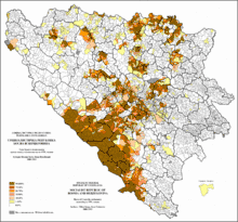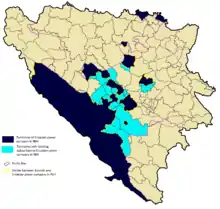 In the beginning of the war JNA and VRS forces gained control of Serb majority areas that were proclaimed part of Herzeg-Bosnia. By late 1992 Herzeg-Bosnia lost Kupres, most of Bosnian Posavina, and Jajce to VRS.[69] The territory under the authority of Herzeg-Bosnia became limited to Croat ethnic areas in around 16% of Bosnia and Herzegovina.[70] The arrival of Bosniak refugees from areas captured by the VRS to HVO-controlled parts of central Bosnia and Mostar altered the ethnic structure and reduced the share of Croats.[71][72]