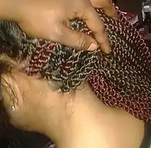 Crochet braids, also known as latch hook braids,[1] are techniques for braiding hair that involve crocheting synthetic hair extensions to a person's natural hair with a latch hook or crochet hook. While crochet braids are a hybrid of traditional braids, they're considered to be more similar to weaves.[2] This method is associated with African hair styles. Known as a protective style, the technique can assist with hair growth if cared for properly. Crochet braids can be worn straight, curly, twisted, or braided.[3]