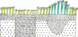 Cropmarks or crop marks are a means through which sub-surface archaeological, natural and recent features may be visible from the air or a vantage point on higher ground or a temporary platform. Such marks, along with parch marks,[1] soil marks and frost marks, can reveal buried archaeological sites not visible from the ground.