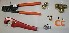 There are two types of fitting that may be used. Crimped or compressive. Crimped connectors are less expensive but require a specialised crimping tool. Compression fittings are tightened with normal spanners and are designed to allow sections of the system to be easily disassembled, they are also popular for small works, esp. DIY, avoiding the need for extra tools.
