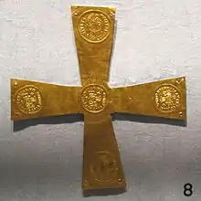 In 569, Justin and Sophia together reportedly sent a relic of the True Cross to the Frankish princess Radegund, who founded a monastery at Poitiers to house it. The event was commemorated in Vexilla Regis by Venantius Fortunatus. They are also recorded as sending relics to Pope John III (reigned 561-574) in an attempt to improve relations – the Crux Vaticana very likely dates from John's reign, perhaps around 568 or 569.[6] Older scholars thought, mainly on the basis of imperial head-dress, that Justin I (r. 518-27) and his empress Euphemia were the donors, but this view seems now rejected.[7]