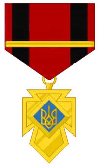 The Cross of Merit (Ukrainian: Хрест Заслуги) was an award of Ukrainian Insurgent Army. It awarded for distinguished services to the state and people of the Ukrainian army. The Order was instituted on January 27, 1944 by the Ukrainian Supreme Liberation Council leaders, Roman Shukhevych and Dmytro Hrytsai.