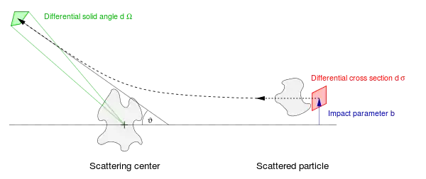 The impact parameter b is the perpendicular offset of the trajectory of the incoming particle, and the outgoing particle emerges at an angle θ. For a given interaction (Coulombic, magnetic, gravitational, contact, etc.), the impact parameter and the scattering angle have a definite one-to-one functional dependence on each other. Generally the impact parameter can neither be controlled nor measured from event to event and is assumed to take all possible values when averaging over many scattering events. The differential size of the cross section is the area element in the plane of the impact parameter, i.e. dσ = b dφ db. The differential angular range of the scattered particle at angle θ is the solid angle element dΩ = sin θ dθ dφ. The differential cross section is the quotient of these quantities, dσ/dΩ.