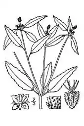 The root of the Croton glandulosus can be characterized by a pungently fragrant tap root. The stem of the plant has stellate trichomes or hairs, small glands and stomata on it.[6] The stem is slender, corymbosely branched or nearly simple and erects from a tap root.[7] The leaves are alternate, and when they are young, they are oval-shaped but as they mature they become more lance-shaped and elliptical. The edges of the leaves are serrated or toothed which makes this species easy to identify. The leaves are located on small petioles and have a white, oval-like gland on either side of the petiole as the petiole meets the stem. The leaves of the plant are whorled and they occur below the flowers. The greater and lesser surface of the leaf has small stellate hairs and when the leaf is crushed it gives off a unique odor.[5]