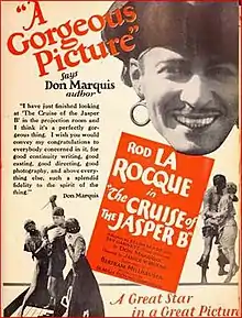 Cruise of the Jasper B is a 1926 American silent action/adventure comedy film produced by Cecil B. DeMille and directed by James W. Horne. The film is loosely based on the 1916 novel of the same name by American poet Don Marquis, although the film adaptation and novel share little in common.[1][2][3]
