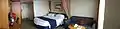 Living arrangements vary by cruise line, but mostly by shipboard position. In general two employees share a cabin with a shower, commode and a desk with a television set, while senior officers are assigned single cabins. There is a set of facilities for the crew separate from that for passengers, such as mess rooms and bars, recreation rooms, prayer rooms/mosques, and fitness center, with some larger ships even having a crew deck with a swimming pool and hot tubs.[48]
