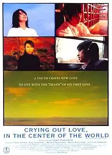 Crying Out Love in the Center of the World (世界の中心で、愛をさけぶ, Sekai no Chūshin de, Ai o Sakebu) is a 2004 Japanese drama film directed by Isao Yukisada and based on the novel Socrates in Love by Kyoichi Katayama.[3] The story follows a man (Takao Osawa) who returns to his hometown and listens to audio diaries recorded by his school sweetheart (Masami Nagasawa) before her death.