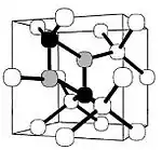 There is a general consensus that B center (sometimes called B1) consists of a carbon vacancy surrounded by four nitrogen atoms substituting for carbon atoms.[1][2][26] This model is consistent with other experimental results, but there is no direct spectroscopic data corroborating it. Diamonds where most nitrogen forms B centers are rare and are classed as type IaB; most gem diamonds contain a mixture of A and B centers, together with N3 centers.