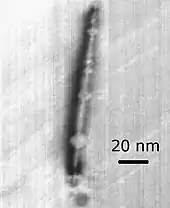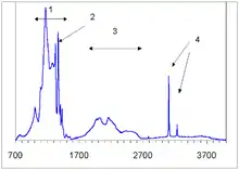 Platelets produce sharp absorption peaks at 1359–1375 and 330 cm−1 in IR absorption spectra; remarkably, the position of the first peak depends on the platelet size.[84][87] As with dislocations, a broad photoluminescence centered at ~1000 nm was associated with platelets by direct observation in an electron microscope. By studying this luminescence, it was deduced that platelets have a "bandgap" of ~1.7 eV.[88]