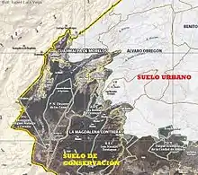 Prior to the 1950s, urbanization of the area was limited because of its terrain.[5] In the mid 20th century, the industrialization of the Valley of Mexico began to reach the borough of Cuajimalpa. The population of the area increased over 900% from 1950 to 1980, with the highest rate of growth in the 1970s.[5][6] New residential construction fueled the growth, covering former forest and agricultural areas especially in areas such as San Lorenzo Acopilco, Las Lajas, La Pila, Las Maromas, Xalpa, Cola de Pato, Atliburros, Cruz Blanca, Moneruco, Chancocoyotl, Teopazulco, Tlapeaca, Texcalco and Pito Real. These include large residential subdivisions such as El Contadero and Lomas de Vista Hermosa, as well as unregulated settlements on the sides of hills and small canyons.[6] The pace of growth remained high in the 1980s, in part due to the 1985 earthquake, which prompted many to move away from the soft soils of the city center into the more solid rock of the west and south of the valley. However, the rapid development began to cause environmental problems, including the building over former pit mines which had later been used as landfills. In the 1990s, efforts were begun to regulate growth and protect natural areas.[6] Much of the territory has been urbanized and contains some of the city's most expensive residential and commercial real estate, with newer developments for upper classes pushing out lower income groups.[5]