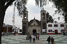 The historic center is still dominated by the Parish of San Pedro, the oldest church in the borough. It was founded in the 16th century but the current building was begun in 1628 and completely finished in 1925.[5][8] The atrium is paved and has only a few trees. The portal is Neoclassic with a frieze formed by metopes and triglyphs from ancient Greek architecture, along with a thick cornice. The main entrance has a niche on each side. A truncated arch is found above the cornice and the base has the papal seal which alludes to Saint Peter, the patron saint. The rest of the facade is covered in red tezontle stone and there are two bell towers. The interior has a single nave. On the main altar, there is an image of Saint Peter, the patron on the town, inside a cypress. The vaults and cupola of the ceiling have simple ornamentation, the side walls have various oil paintings and there are a number of images of various saints.[7][8]