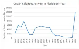 Cuban immigration greatly affected Miami's future demographics. For example, the net immigration of African Americans into Miami was reduced during the 1960s in comparison to previous years.[6] This was the result of Cuban immigrants competing for jobs that had often been afforded to African Americans living in Miami. This reduction of immigration of non-Hispanics displayed the growing presence of Cubans in Miami. Miami "posts a low emigration rate-43.6 per 1,000. This, of course, stems from the huge Cuban presence in Dade County and is testimony to the holding power of the Cuban enclave in Miami".[7]