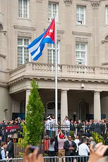 Cuba and the United States officially resumed full diplomatic relations at midnight on July 20, 2015, with the "Cuban interests section" in Washington, D.C., and the "U.S. interests section" in Havana being upgraded to embassies.[54] A ceremony was held at the Cuban Embassy to raise the flag of Cuba, with U.S. Secretary of State John Kerry and Cuban Foreign Minister Bruno Rodríguez Parrilla holding a joint news conference afterward at which they emphasized both the step forward in bilateral relations and the remaining political differences between the Cuban and U.S. governments.[55] Kerry flew to Cuba in late July for a ceremony at which the flag of the United States was raised over the US Embassy in Havana.[56]
