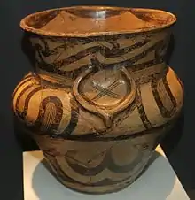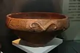 Characteristically vessels were elaborately decorated with swirling patterns and intricate designs. Sometimes decorative incisions were added prior to firing, and sometimes these were filled with coloured dye to produce a dimensional effect. In the early period, the colours used to decorate pottery were limited to a rusty-red and white. Later, potters added additional colours to their products and experimented with more advanced ceramic techniques.[7] The pigments used to decorate ceramics were based on iron oxide for red hues, calcium carbonate, iron magnetite and manganese Jacobsite ores for black and calcium silicate for white. The black pigment, which was introduced during the later period of the culture, was a rare commodity: taken from a few sources and circulated (to a limited degree) throughout the region. The probable sources of these pigments were Iacobeni in Romania for the iron magnetite ore and Nikopol in Ukraine for the manganese Jacobsite ore.[41][42] No traces of the iron magnetite pigment mined in the easternmost limit of the Cucuteni–Trypillia region have been found to be used in ceramics from the western settlements, suggesting exchange throughout the entire cultural area was limited. In addition to mineral sources, pigments derived from organic materials (including bone and wood) were used to create various colours.[43]