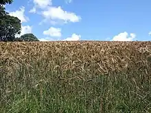 Central Pembrokeshire, from the River Cleddau estuary to the west coast, grows cereals for cattle,[24] while most coastal farms are laid down to 50% arable land and with 40% under short ley farming, with 10% permanent pasture close to the farm. The arable rotation often included early potatoes, in the first and second years, sometimes with sugar beet or broccoli in the same year, when the potatoes are taken out in June, then three corn crops, the last under sown with a three-years ley, the sequence may be varied, depending on the price of early potatoes, broccoli and sugar beet.[5] Oats are the most popular crop, followed by early potatoes, barley for seed, wheat and sugar beet.[4]