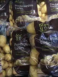 The main crops are early potatoes, winter brassicas and root vegetables with the harvesting period being between end of October and mid-May.[25] South Pembrokeshire is known for its root vegetables and Pressdee notes that, until recently, there were not many recipes using them, although dishes such as creamed swede have since become popular.[26] Other Pembrokeshire crops include cauliflower, asparagus and soft fruit[27] Cauliflowers require a frost free climate when the curd is developing and the mild climate of Pembrokeshire means that it is an important local crop, with the county supplying this vegetable to national markets.[28]